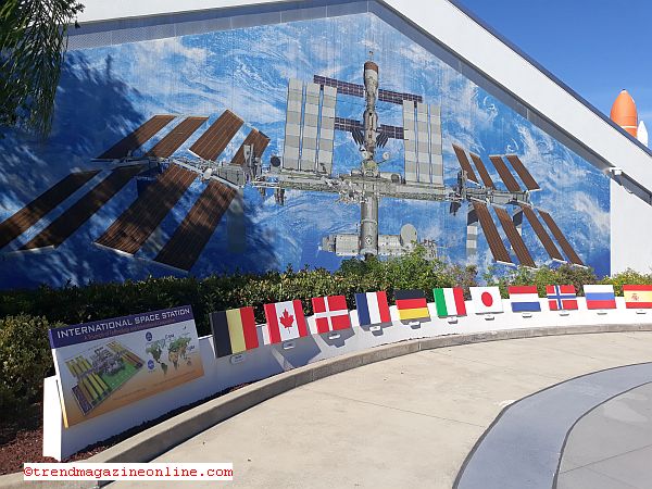 Space Station on the side of a building with a flag of each country participating