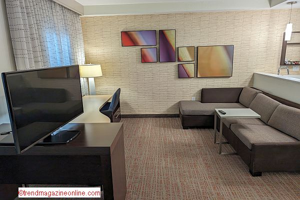 The living room at the Marriott Bonvoy Residence Inn Orlando perfectly blends comfort and style, creating a cozy retreat for relaxation or work. The spacious layout features a plush sectional sofa, ideal for lounging after a day of exploring Orlandoβs attractions π’π΄. The warm tones of the decor, complemented by contemporary artwork adorning the walls π¨, add a touch of sophistication and warmth to the room. A flat-screen TV, positioned for optimal viewing, ensures entertainment is just a click away πΊπΏ. Adjacent to the sofa, a work desk with a comfortable chair and ample lighting caters to business travelers or anyone needing a productive workspace π»βοΈ. The large window, dressed with sheer curtains, allows natural light to flood the room during the day π, while a standing lamp provides a soft, ambient glow in the evening π. Thoughtful touches, like conveniently placed power outlets and USB ports, make charging devices effortless, enhancing the overall functionality of this inviting space ππ±. Whether youβre unwinding with your favorite show, catching up on emails, or enjoying a cup of coffee, the living room at this Residence Inn offers a versatile and welcoming environment for every guestβs needs βπ .