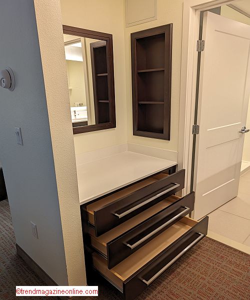The vanity area is an equally impressive highlight, designed with practicality and elegance in mind. Its expansive countertop offers ample space for toiletries, makeup, and grooming essentials, making it perfect for couples or families ππͺ. The built-in mirror, framed with subtle lighting, ensures excellent visibility for getting ready, whether you're preparing for a day at the theme parks or a night out in Orlando π’β¨. Below the counter, multiple pull-out drawers provide generous storage for personal items, keeping the area tidy and organized ποΈ. On one side of the vanity, shelves add a decorative yet functional element, ideal for quick-grab items or decorative touches. Marriottβs thoughtful design seamlessly combines functionality and style, ensuring a pleasant and stress-free stay for all guests πΌπ.